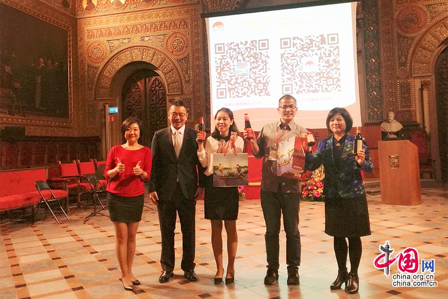 2017年11月,李锦记企业代表陈姝(左一)、孔君道(左二)与国家汉办志愿者工作处郭骄阳处长(右一)向西班牙孔子学院赠送李锦记酱料产品