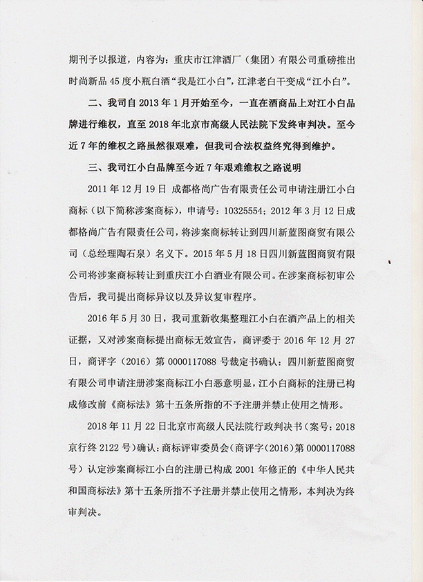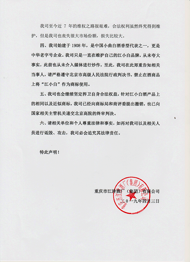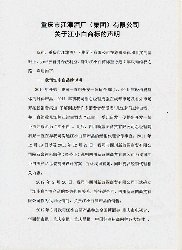 我司,重庆市江津酒厂(集团)有限公司在尊重法律和事实的基础上,为维护自身合法利益,针对江小白商标至今近7年艰难维权之路,声明如下: