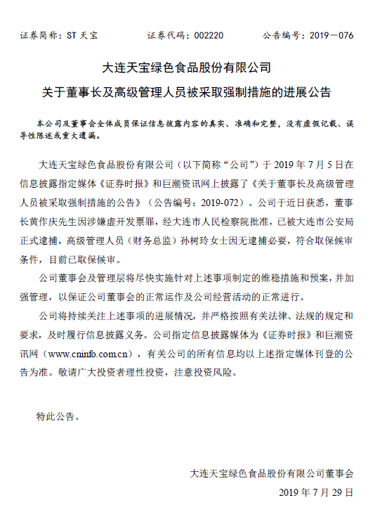 ST天宝:董事长黄作庆因涉嫌虚开发票罪被逮捕