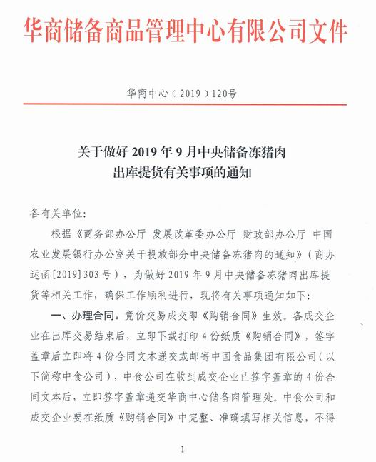 同时,华商储备中心还公布了《关于做好2019年9月中央储备冻猪肉出库提货有关事项的通知》。通知称,储备冻猪肉的出库将实行先款后货原则,由中食公司负责出库提货事宜,并向成交企业提供检疫检验证明。出库交易结束后再转至华商中心储备肉管理处进行提货。