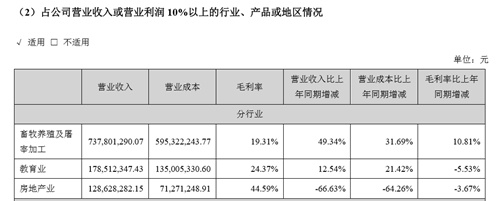 从营业收入构成来看,2019年,罗牛山的畜牧养殖及屠宰加工和教育业均同比增长,而房地产业虽然毛利率最高,但是营收不足1.3亿元,同比下滑66.63%。