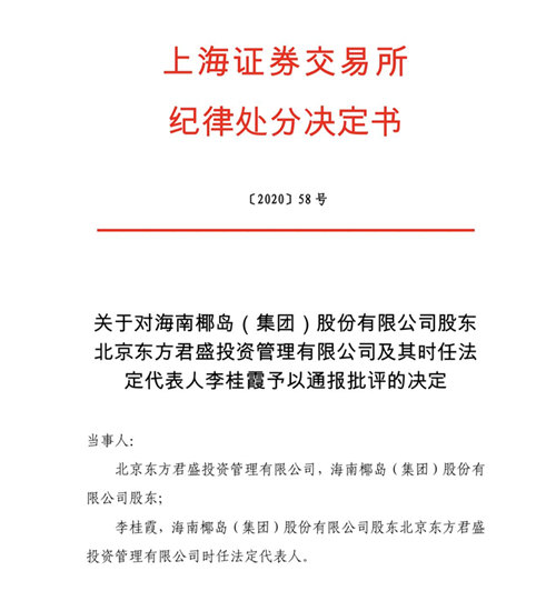 因重大资产重组事项未落地,仍处于停牌之中的海南椰岛,在6月16日发布了一则来自于上海证券交易所的批评通报。在这则通报中,海南椰岛的大股东北京东方君盛投资管理有限公司(以下简称“东方君盛”)及其时任法定代表人李桂霞,因增持海南椰岛股份事件存在违规事实,故被上海证券交易所通报批评。