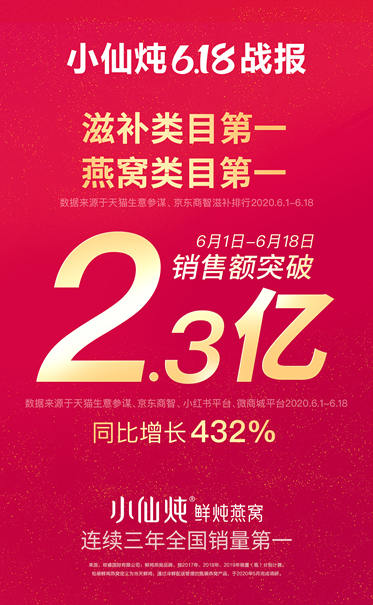 据天猫生意参谋、京东商智、小红书平台、微商城平台数据显示,自6月1日至6月18日,小仙炖鲜炖燕窝销售额突破2.3亿元,同比增长432%,同时占据滋补类目、燕窝类目、鲜炖燕窝类目第一名。天猫生意参谋交易指数显示,小仙炖是第二名的1.5倍。值得注意的是,在小仙炖的引领下,中式滋补品牌首次实现对国际保健品牌的超越。这是继去年双十一销量破亿之后,小仙炖在快速增长路上的又一重要里程碑。