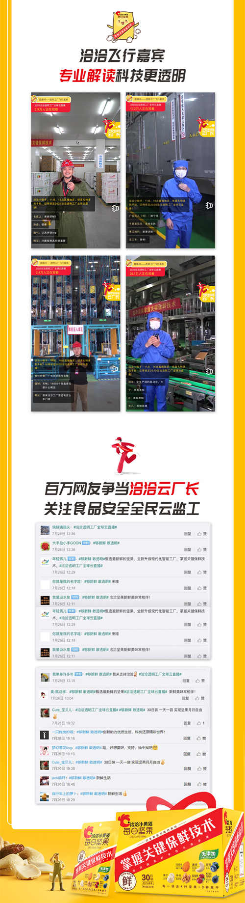 继7月25日,洽洽召开新品上市发布会,推出两款战略新品后,时隔不到两日,7月27日,洽洽上线全面升级的透明工厂全球云直播,向全球消费者全方位展现其原料产地及坚果生产工艺,引发众多网友关注讨论,并在社会和行业内掀起轰动。