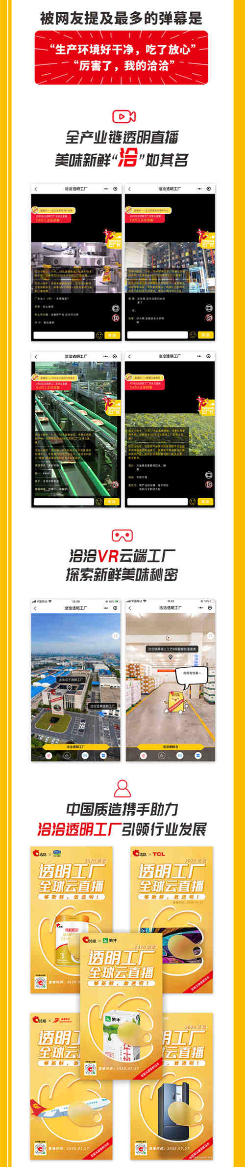 洽洽透明工厂全球云直播的成功,除了得到食品行业认可与热议,还得到同样坚持“质造”的多个国产品牌支持,如蒙牛、海尔、TCL电视等各行各业的多家品牌纷纷通过品牌官微为洽洽声援助力,“中国质造”的同行者共同拉起“中国质造”的高标准线,树立高品质标杆。