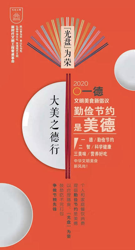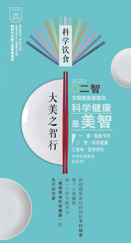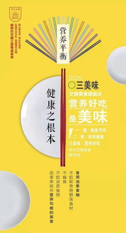 “新时代文明工程餐桌革命”新起点,为改变生活观念、改变不良习惯、改变生活方式提出文明美食新倡议:“一德二智三美味”——勤俭节约是美德、科学健康是美智、营养好吃是美味。