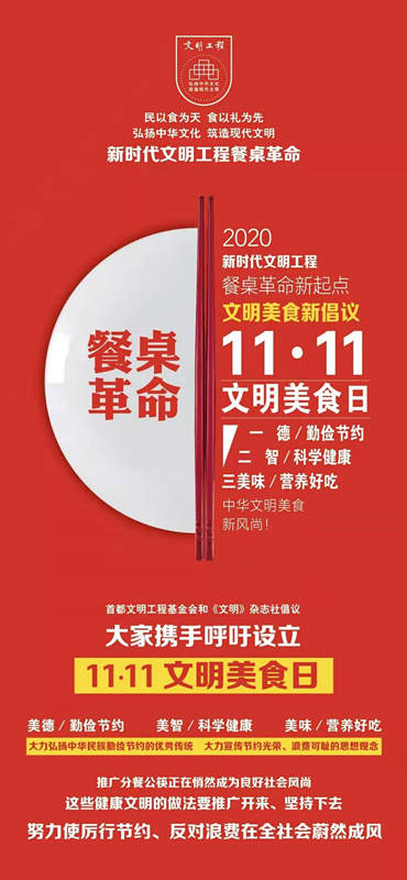 “新时代文明工程餐桌革命”呼吁大家携手推动设立“11·11文明美食日”。