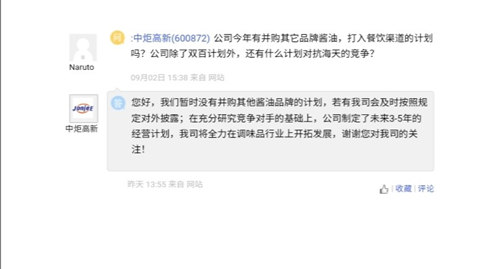 9月15日,针对投资者提出的“公司近年有并购其他品牌酱油,打入餐饮渠道的计划吗?”等问题。中炬高新在上证e互动平台回应称,暂时没有并购其他酱油品牌的计划,若有会及时按照规定对外披露;在充分研究竞争对手的基础上,公司制定了未来3—5年的经营计划,将全力在调味品行业上开拓发展。