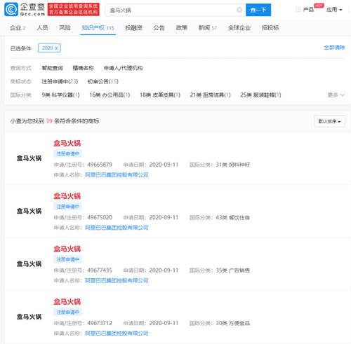 企查查APP显示,阿里巴巴集团控股有限公司于9月11日申请注册盒马火锅商标,其中包含30类方便食品、35类广告销售、43类餐饮住宿、31类饲料种籽等四大类别。同时该公司于9月末申请注册闪骑侠、好壹点、零家小食纪。