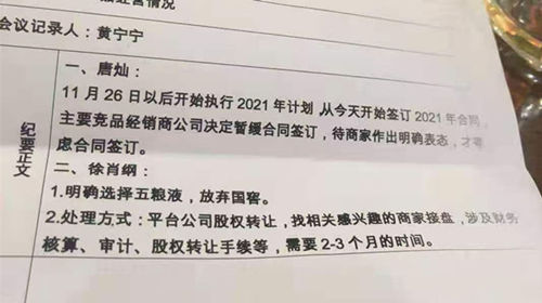 根据记者拿到的这份会议纪要显示,会议发生在2020年11月26日上午,参与方为五粮液华东营销中心杭州基地总经理唐灿和杭州华商糖业烟酒公司总经理徐肖纲。纪要正文中,唐灿要求:11月26日以后开始执行2021年计划,从今天开始签订2021年合同,主要竞品经销商公司决定暂缓合同签订,待商家作出明确表态,才考虑合同签订。而徐肖纲则表示,1.明确选择五粮液,放弃国窖。2.处理方式:平台公司股权转让,找相关感兴趣的商家接盘,涉及财务核算、审计、股权转让手续等,需要2~3个月的时间。