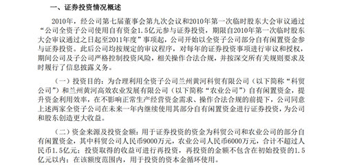 资金来源及投资金额方面,兰州黄河称,用于证券投资的资金为科贸公司和农业公司的部分自有闲置资金,其中科贸公司人民币9000万元,农业公司人民币6000万元,合计不超过人民币1.5亿元;投资取得的收益可进行再投资,再投资的金额不包含在初始投资的1.5亿元以内;在该额度范围内,用于投资的资本金循环使用。