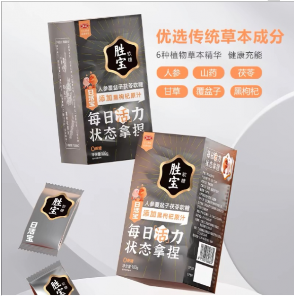 胜宝软糖源于肾宝片同源配方,结合明代补真膏与宋代灵仙散的配方,加以创新,更适合现代人的疲劳体质。富含人参、覆盆子、甘草、茯苓、山药、黑枸杞等6种药食同源成份,美味随地享受,状态随时拿捏。