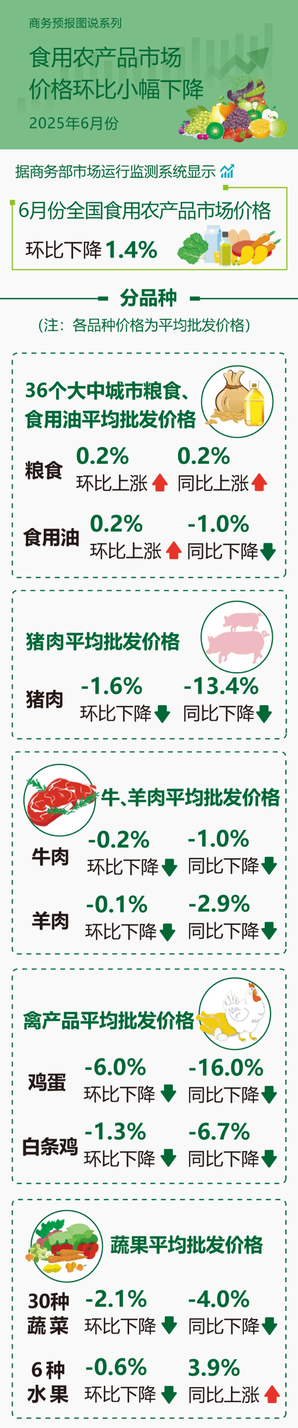 据商务部市场运行监测系统显示,6月份全国食用农产品市场价格环比下降1.4%。