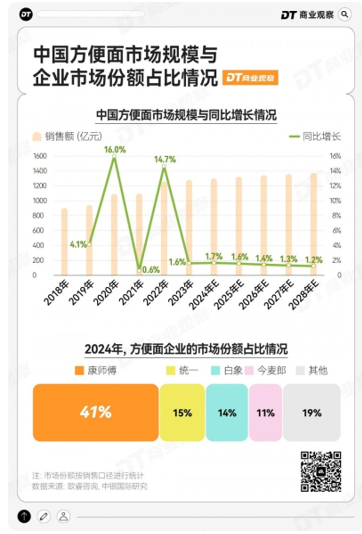 如果拉大视角站在行业去看,根据欧睿咨询的数据,2023年中国方便面市场规模约为1282亿元,未来几年尽管方便面市场的增速有所放缓,但还在维持增长。