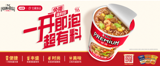 与此同时,PREMIUM优选杯可以看作是康师傅以品类根基创新升维的产品。颗粒饱满的肉粒、均衡的荤素搭配,创造了超出预期的产品价值感。这一次,康师傅将经典美味做到了一个新高度,红烧牛肉等经典口味升级之下“极致便携的体验”和“所见即所得的丰盛”,大大激发了消费者购买尝鲜的欲望。