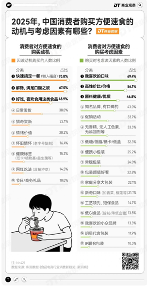 根据库润数据发布的《食品电商行业消费新趋势新洞察》,2025年中国消费者方便速食的购买动机中,“快速搞定一餐”位列首位;随后是“解馋”“好吃”等口感价值需求。