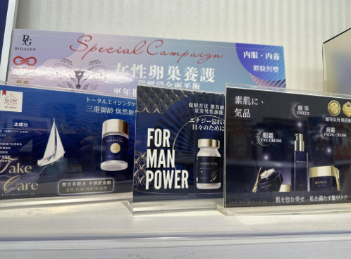 东京银座的一家免税店内,博奥真Bioagen的核心产品系列整齐陈列,从精华到口服补剂,每一款产品都融合了多项专利成分,如用于激活线粒体的Mitolive®、Meta-Pure™、ACT-Mito™等因子直接靶向细胞能量工厂,帮助用户实现从内而外的抗衰效果。