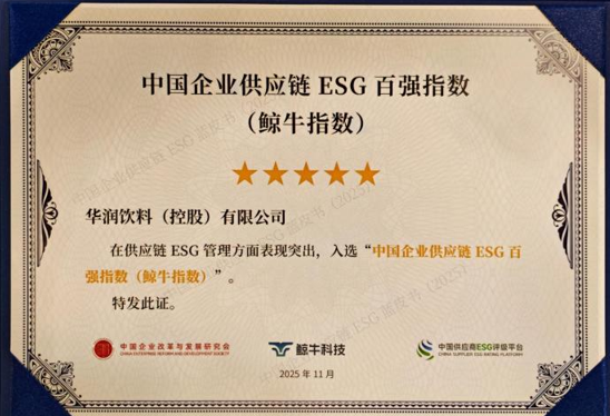 为期两天的会议还发布了《中国企业供应链ESG蓝皮书(2025)》暨“中国企业供应链ESG百强指数(鲸牛指数)”和2025年“ESG鲸牛奖”。华润饮料凭借在供应链ESG管理及ESG治理方面的优秀实践和成效,成功入选“中国企业供应链ESG百强指数(鲸牛指数)”,获评ESG鲸牛奖之“ESG治理先锋”。
