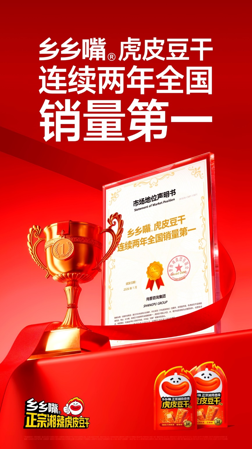 乡乡嘴虎皮豆干凭借持续强劲的市场表现力,成功实现连续两年蝉联全国销量第一的佳绩,于2026年1月获得尚普咨询集团颁发的市场地位认证证书,以权威数据背书筑牢行业龙头地位。