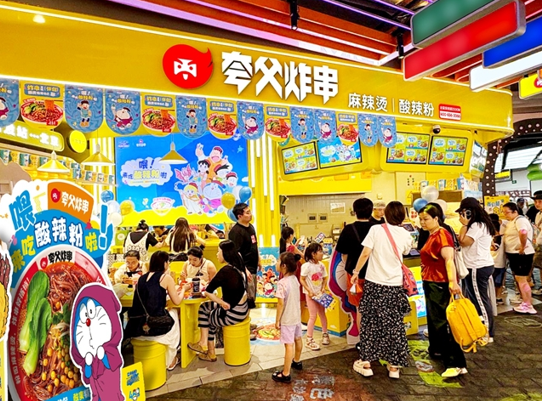 在注意力经济时代,面对年轻消费群体将消费视为社交表达与身份认同的普遍行为特征,品牌需通过持续制造新鲜话题来建立深层情感连接。夸父炸串选择与经典IP“哆啦A梦”联名,正是看中其跨越代际的情感号召力,旨在将IP积累的庞大情感资产注入品牌与新品类,实现从流量到消费的价值深化。在此次联名活动中,夸父炸串并未局限于短期流量收割,而是致力于与“哆啦A梦”这一经典IP共建长期品牌价值,打造了一套“可感知、可参与、可分享”的立体化体验架构。线下,全国主题门店通过特色立牌、主题装饰与限量周边,营造出强烈的沉浸式打卡氛围;线上,则通过精心设计的社交互动玩法,有效激励用户分享,形成传播裂变,构建了从线下体验到线上扩散的完整闭环,持续输出品牌情感价值。