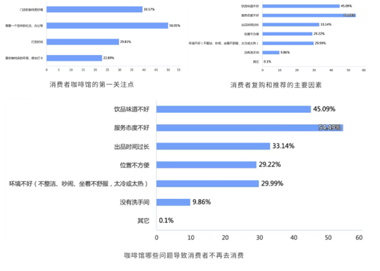 消费者选择一家咖啡馆始于“颜值”,后续看重品质和服务。咖啡不好喝、服务态度不好,是导致消费者不再复购的主要因素。