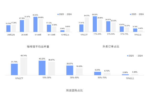 日均出杯50-120杯的咖啡店有所增加。外卖占比在11%-50%之间的商家超过6成,到店团购占比最多区间是10-30%。