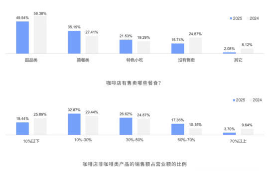 2025年,不少咖啡馆加入了更多非咖啡类的产品。受访咖啡馆主选择未售卖非咖啡类产品的仅占15.74%,相比2024年下降了近10%。非咖啡产品在总营业额中的占比也有明显提升。
