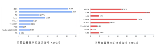 消费者喜欢的连锁咖啡品牌,星巴克和库迪的受欢迎程度均大幅提升,库迪与瑞幸的差距进一步缩小。