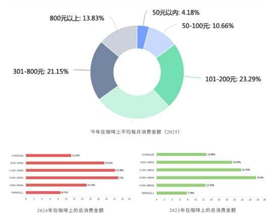 2025年的调查,咖啡消费金额更为具体,超8成受访者月均消费咖啡100元以上。其中,月均咖啡消费800元以上的占到了13.83%,也就是说这部分消费者日均购买咖啡一杯。