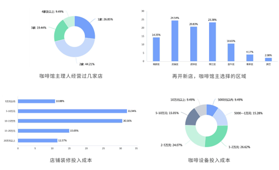 受访咖啡主理人中,超过半数经营过两家以上店铺,开店装修投入上,5到15万元是选择最多的区间,咖啡设备的上最多的是1-5万元。