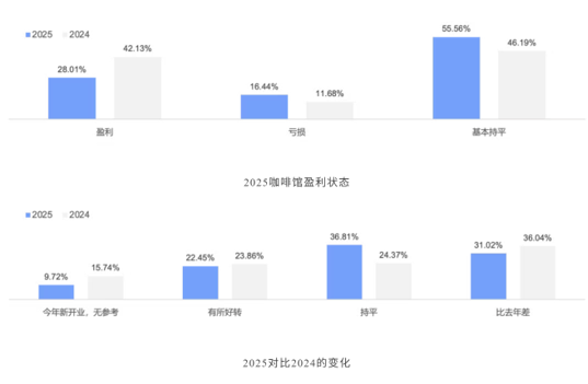 受访的咖啡馆主理人中,盈亏持平的占到了55.56%,亏损的比例有所增加。2025年比2024年差的占比31.02%。