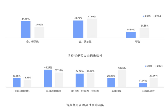 咖啡消费者中自己做咖啡的比例,相较于2024年有所提高。在购置的咖啡设备类型上,选择全自动咖啡机和半自动咖啡机的消费者比例均有所增加,而没有购买过咖啡设备的比例下降明显。