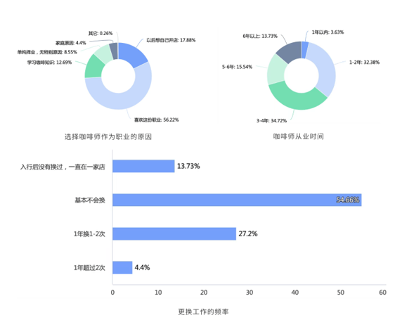 兴趣永远是最好的动力!咖啡师选择这一行,最主要的动机是出于对本职业的喜爱,这一比例达到56.23%。排在第二位的动机是“希望自己开店”,占比17.88%。有意思的是,大多数咖啡师并不热衷于频繁更换工作,而更倾向于在一家咖啡馆长期稳定发展。
