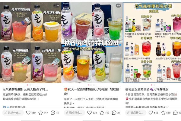 在这场调酒消费的新浪潮中,年轻人的创作热情被持续点燃,各大社交平台成为调饮文化的传播阵地。小红书#自制神仙饮品话题站内浏览量达122亿,每月笔记增量保持6000+的高位,热度常年在线;抖音#调酒话题收获119亿播放量,2025年新增的#调酒接力挑战玩法更是突破5.1亿次播放,#调酒话题参与人次达76万。海量UGC内容背后,一个清晰的消费趋势逐渐显现:元气森林成为年轻人新派调酒的首选。