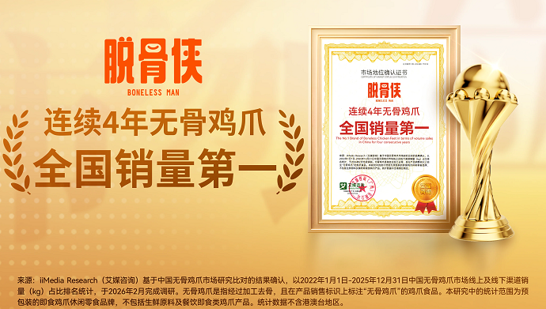 一只去骨鸡爪,能做到怎样的生意规模?卓希集团旗下品牌脱骨侠给出了答案:连续4年拿下全国无骨鸡爪销量第一,累计卖出1亿+罐,年GMV超20亿元,线下覆盖10万+终端,成为名副其实的“全球鸡爪专家”。