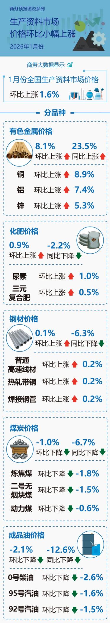 商务大数据显示,1月份全国生产资料市场价格环比上涨1.6%。