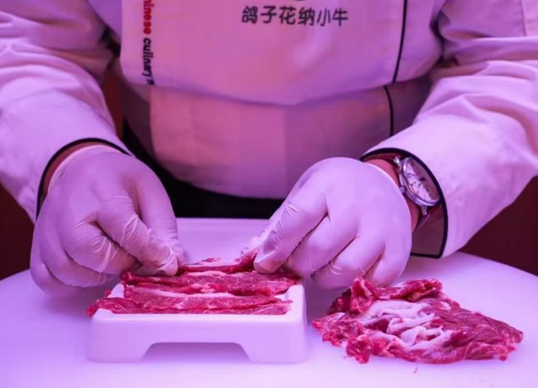 3月3日,笔者在该火锅店看到,店内采用潮汕牛肉火锅模式,一人一锅,牛肉现点现切。据从潮汕地区聘请的厨师介绍,店内牛肉全部来自公司自养安格斯牛,"雪花牛肉纹理细密,品质好的部位可以生食"。