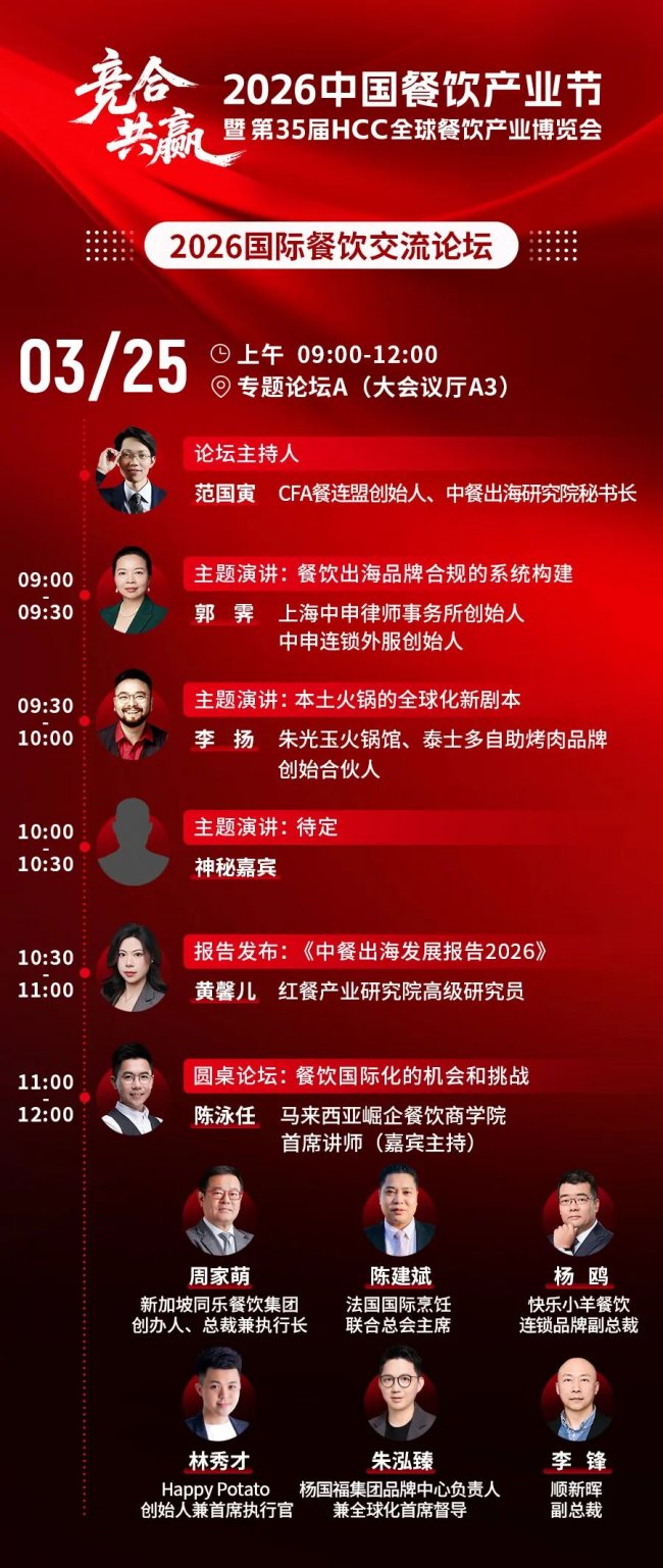 2026国际餐饮交流论坛议程正式公布。论坛聚焦餐饮国际化的合规风控、本土化运营与供应链协同等核心议题。通过中外餐饮领军者的深度对话,为行业提供全球化布局与本土化运营的双向实战思路。