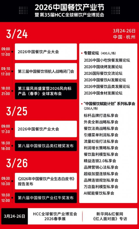 本届产业节在以往高规格、高品质盛会的基础上进行升级,设置了2026中国餐饮产业大会、系列专题论坛、第三届中国餐饮领航人战略闭门会、第三届风尚盛宴暨2026风向标产品(春季)全球发布会、第六届中国餐饮产业红牛奖、第八届中国餐饮品类红鲤奖、“中国餐饮赋能计划”系列私享会、HCC全球餐饮产业博览会·2026春季展、新华网&红餐网《红人面对面》专访等环节,影响力辐射餐饮全产业链。预计将吸引过万业内外精英到场,共赴这场属于中国餐饮人的盛宴。