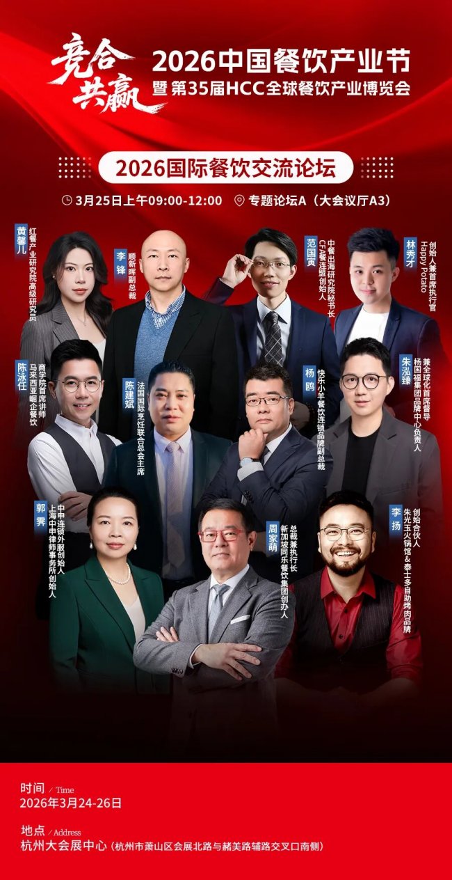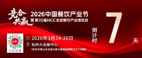 在此背景下,2026中国餐饮产业节暨第35届HCC全球餐饮产业博览会应运而生。本届产业节由世界中餐业联合会、红餐网联合主办,以“竞合·共赢”为主题,将于3月24-26日在杭州大会展中心举办。