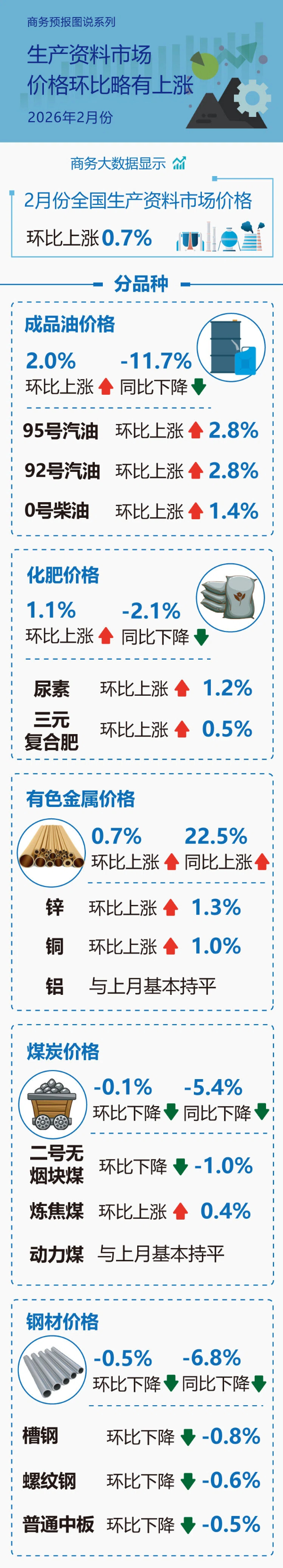商务大数据显示,2月份全国生产资料市场价格环比上涨0.7%。