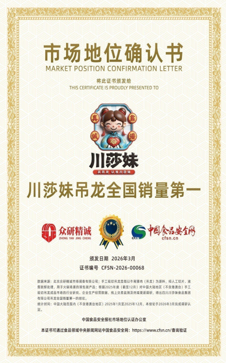 经国家统计局批准的专业涉外调查机构——北京众研精诚市场调查有限公司多维度深度溯源、全链路数据核验,并由国家级权威媒体平台中国食品安全报社市场地位认证办公室审核,旗下品牌核心产品“川莎妹吊龙”凭借卓越的品质与广泛的消费者口碑,成功斩获“全国销量第一”的殊荣!这一荣誉不仅是对川莎妹产品实力的最高褒奖,更是川味火锅食材在全国市场突围的生动见证,彰显了民族品牌在品质坚守与创新发展中的强劲底气。